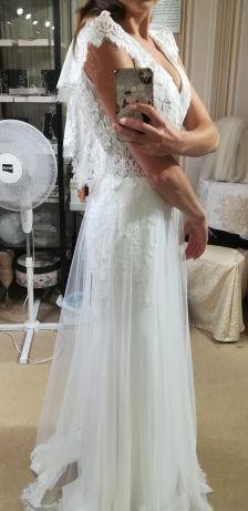 Sprzedam suknię ślubną z kolekcji 2019 r. polskiego producenta. Suknia szyta na miarę, na wzrost 172 + 6 cm szpilki. Suknia jest koloru ecru, góra koronkowa. Dół składa się z przylegającego do ciała, gładkiego materiału, na kształt ryby, natomiast na wierzchu puszczona jest warstwa tiulu, zakończona koronką. Suknia jest leciutka, bardzo wygodna i elastyczna, nie krępuje ruchów. Stan idealny. Zakupiona za 3500 zl, na co posiadam umowę oraz paragony. Rozmiar to 36. W celu uzyskania szczegółowych informacji zapraszam do kontaktu :)