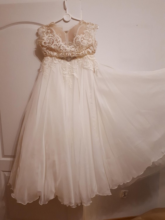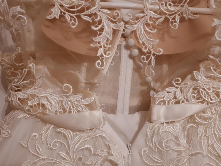 • Góra sukienki składa się z gorsetu w kolorze cielistym, zdobiony ręcznie, naszywany francuską gipiurą. Gorset posiada wszyte miseczki.