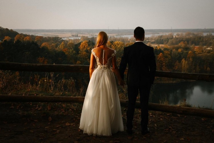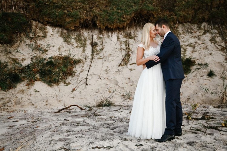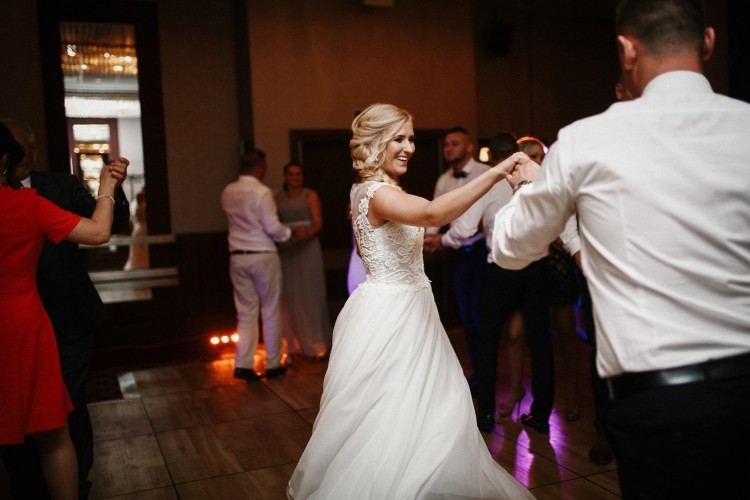 Suknia jest zwiewna i lekka, bardzo wygodna, dół wykonany z szyfonu, góra z siateczki ozdobionej kamieniami i perłami, które pięknie połyskują podczas ruchu. Tył sukni zapinany na zamek i guziki, z przodu wszyte są miseczki podtrzymujące piersi. Suknia posiada podpinany tren