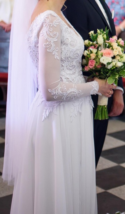 Góra sukni zdobiona koronkową gipiurą, dół sukni to pięknie układający się i lekki muślin. Długi rękaw sukni to elastyczna siateczka ozdobiona koronką, nie krępuję ruchów. Dekolt z przodu i wycięcie z tyłu ładnie wysmuklają sylwetkę. Zapinana z tyłu na kryty zamek.