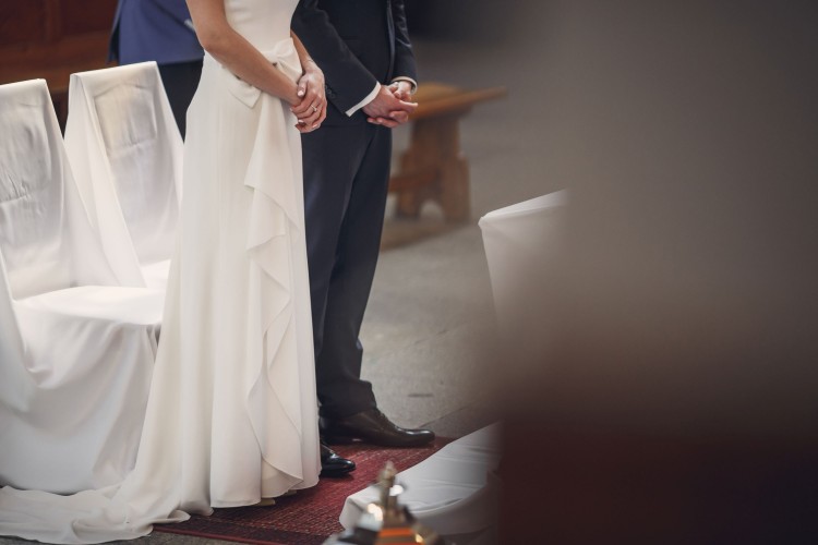 Suknia z podpinanym trenem (podpięcie widać na zdjęciu).