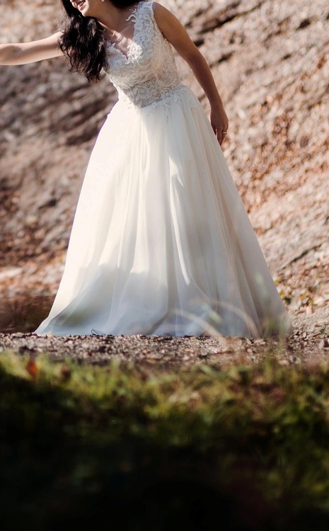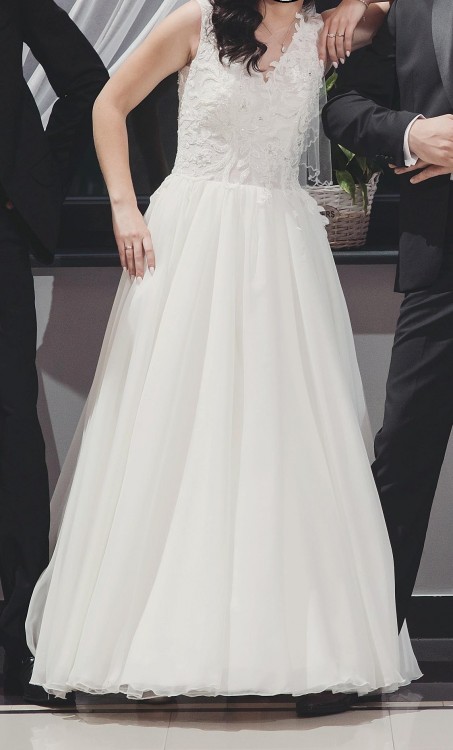 Suknia jest w kolorze śmietankowym, posiada delikatny tren.