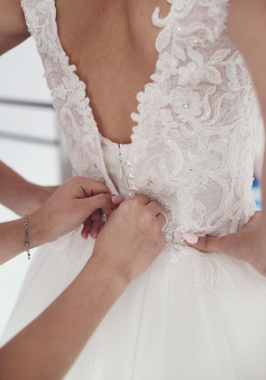 Plecy w literę V, góra zdobiona, dekolt pokryty cienką warstwą tiulu.