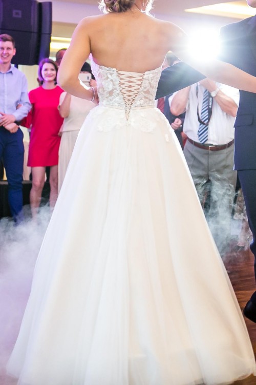 Suknia charakteryzuje się ręcznie naszywanymi aplikacjami w postaci kwiatów znajdujących się na gorsecie oraz wierzchniej warstwie tiulu.