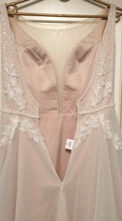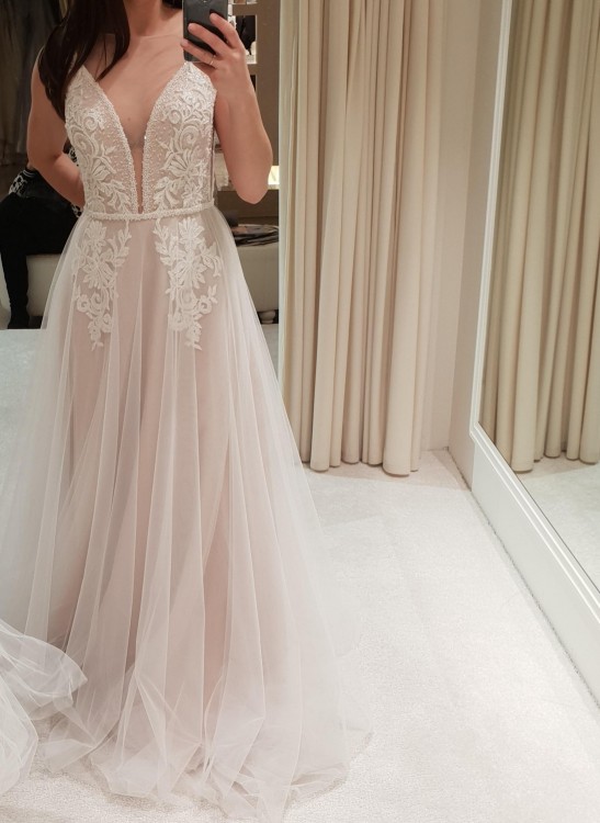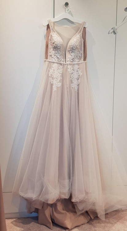 Sprzedam suknie ślubną marki Gellena. Model to Nora, z kolekcji 2019 r. Sukienka zakupiona w salonie w Zduńskiej Woli "La Perle". Suknia jest z trenem < 3 Kolor sukni jest nieoczywisty, co mnie osobiscie najbardziej urzekło - bo w zależności od światła wpada od lekkiego różu nawet w lekkie capucino (efekt spowodowany tym ze pierwsza, warstwa która jest na samym spodzie jest taka złotawo-cappucino, a wierzchnie wartswy to biały tiul. Pomiedzy warstwami są aplikacje - tez swietny efekt, bo dzieje sie na sukni ale są one pieknie stonowane tym ze są wtopione pod spodem. Góra sukni za to przepięknie zdobiona koralikammi i aplikacjami, pieknie sie blyszczy, ale nie jest to efekt "bazarowy" jak w niektorych sukniach ślubnych:) po prostu cudnie idbija światlo przy ruchu:) Plecy w sukni są głeboko wycięte w litere "V", boczki i przód również z oryginalnym wycięciem - tutaj zabepieczone cielistą siateczką takze wszystko trzyma sie na miejscu, bez zadnego dyskomfortu:). Tren jest dziecinnie łatwo podpinany (mam filmik jak się to robi - kokardka + 2 haftki:) po podpieciu tez cudnie się ułada:) nawet ładniej to wyglada niz bez:) Suknia do tego ma wszyte miseczki, więc bez obaw nie trzeba kombinowac z biustonoszem - miseczka na biust B/małe C. Suknia do tego jest naprawde leciutka, takze bez problemu mozna przetańczyc w niej cala noc:)