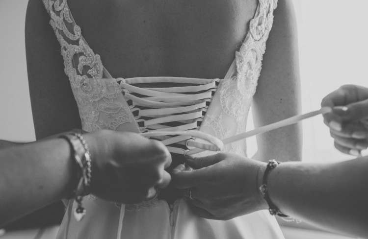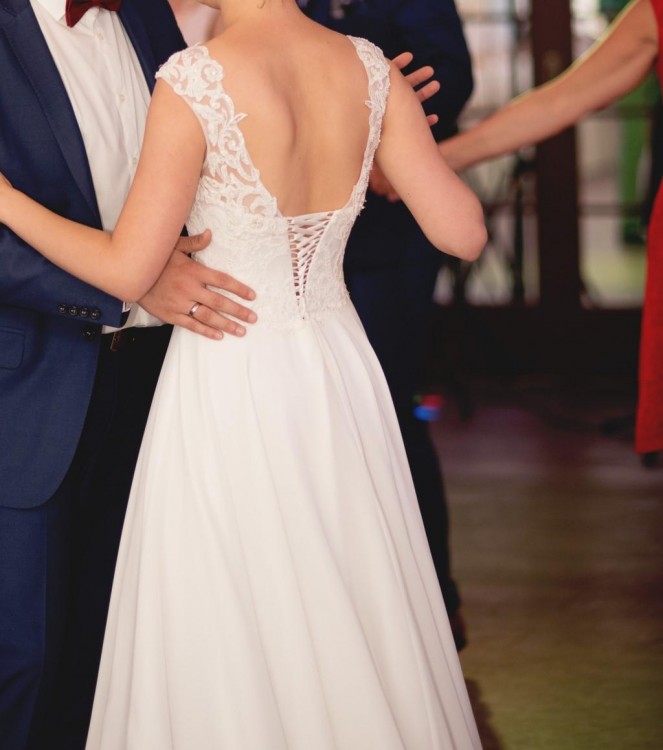 Góra sukni: koronka z delikatnymi koralikami które pięknie odbijają światło, wbudowany delikatny gorset który pozwala na założenie sukni bez dodatkowej bielizny (gorset w żaden sposób nie krępuje ruchów), tył wiązany i częściowo zapinany na zamek, dodatkowa wstawka na plecy pod wiązanie.