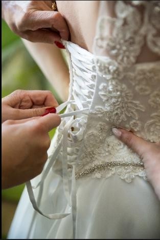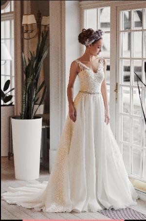 Suknia w kroju klasycznej litery "A" w kolorze śmietankowym. Gorset z delikatnie błyszczącej koronki, dół gładki. Suknia jest wiązana przez co dobrze dopasowuje się do sylwetki i nie straszna jest nagła utrata wagi tydzień przed ślubem :). Posiada wszyte miseczki. Pasek jest delikatnie przyszyty, więc można go łatwo odpruć. Jest wyczyszczona, w bardzo dobrym stanie.