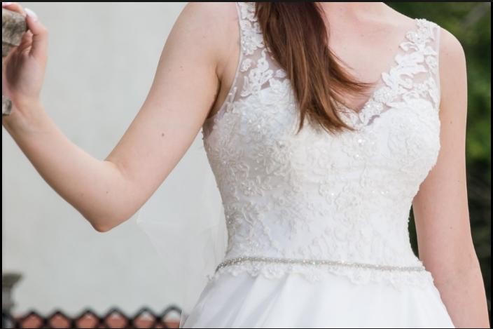 Do sukni dołączam krótki nabłyszczany welon oraz tren ozdobiony koronką jak na gorsecie, przyczepiany na bezbarwne (kompletnie niewidoczne) zatrzaski - umożliwia to jego całkowite odczepienie, przez co nie robi się "kaczy kuperek" jak w przypadku podpinanych trenów - oba elemeny również są wyczyszczone.