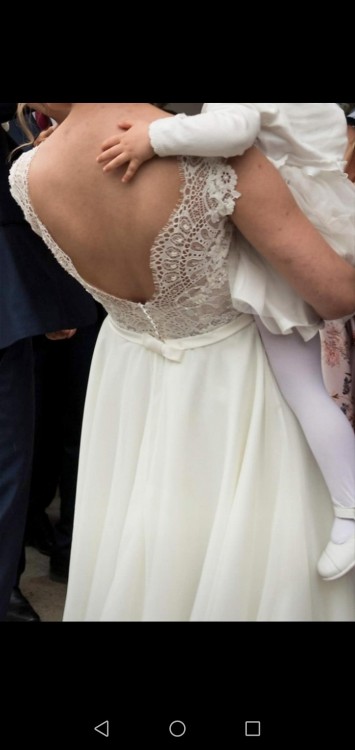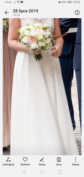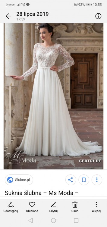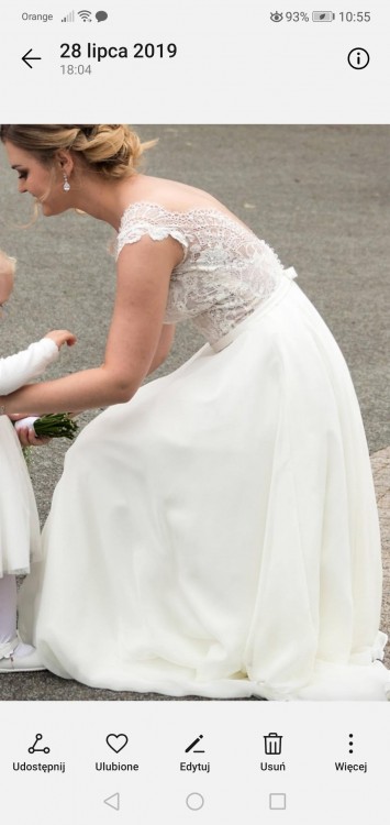 Wszyte miseczki C. Suknia mierzona na wieszaku od ramienia do końca 150 cm. Plecy w V, kokardka z tyłu, na krótki rękaw. Kolor śmietankowy. Dol muslin. Prezentowała się świetnie. Różni się od oryginału ponieważ wprowadziłam kilka zmian.