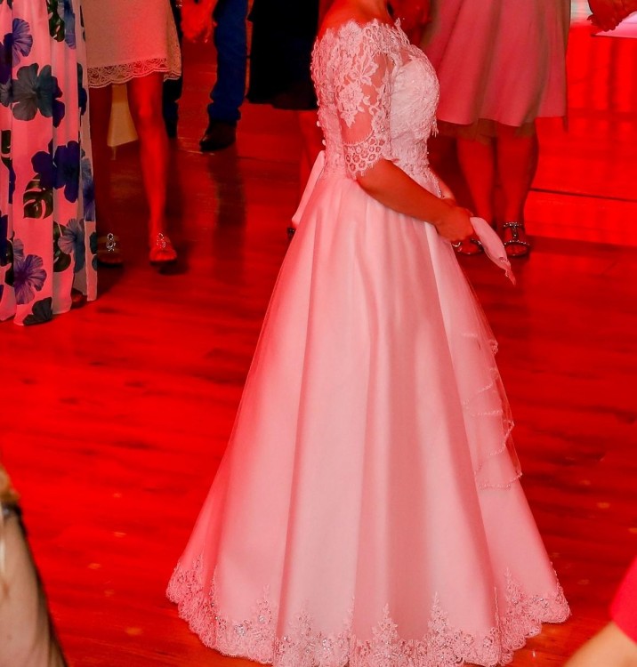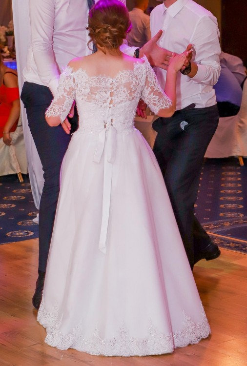 Sukienka posiada halkę z kołem dodatkowo dokładam również bolerko, które widać na zdjęciu.