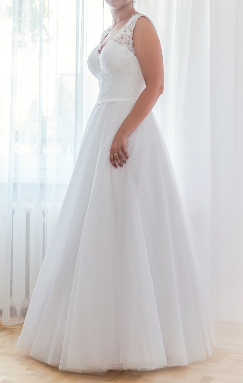 Mam do sprzedania suknię ślubną w kolorze białym, rozm. 38 na wzrost 170cm + 8cm obcas. Do sukni dołączę narzutkę na ramiona i przypinany tren, których nie wykorzystałam. Suknia wiązana z tyłu. Polecam :)