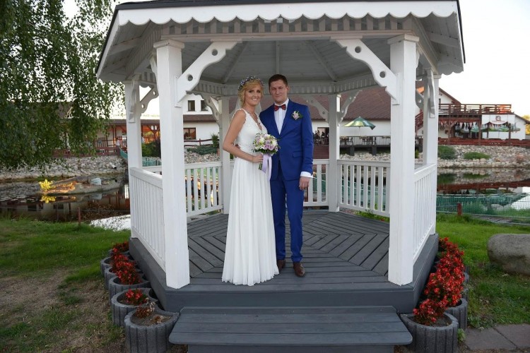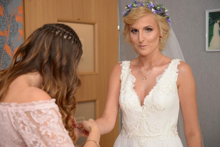 Kolor śmietankowy, jednak jest to bardzo delikatny odcień, ponieważ nie rzucała się w oczy różnica pomiędzy suknią, a białą koszulą pana młodego.