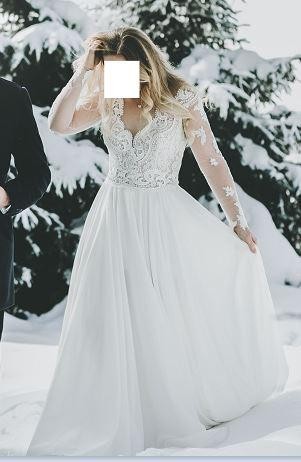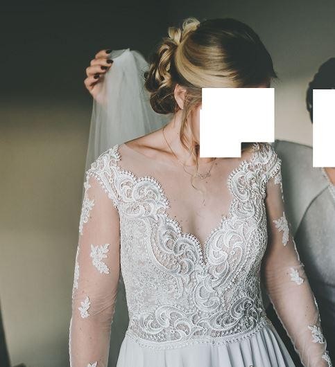 - suknia o kroju litery A z dopasowaną, koronkową górą oraz zwiewnym, muślinowym dołem
