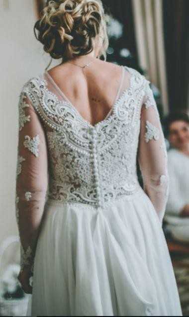 z rozcięciem z boku, po lewej stronie. Z tyłu sukni dekolt w kształcie V (ukryty suwak), posiada również długi tren, podpinany na guzik,