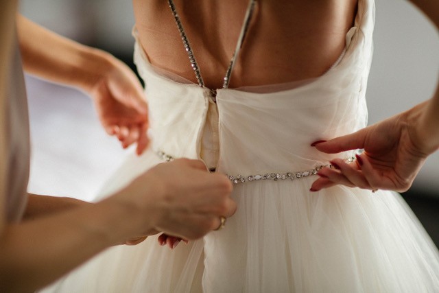 Suknia ma piękny, długi tren, podpinany na guzik. Wykończona pięknie mieniącymi się kamieniami. Ramiączka są całe z kamyków- ale na nich nie opiera się suknia. Ma wszyty specjalny pas, który- nawet bez jej zapięcia- trzyma suknie na swoim miejscu.