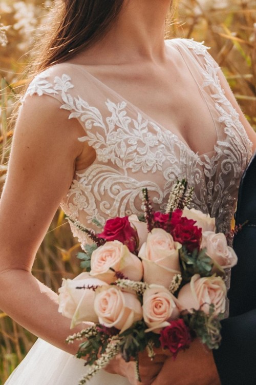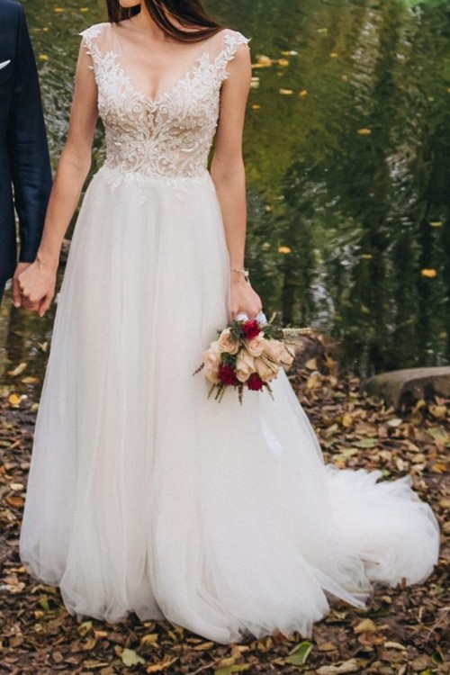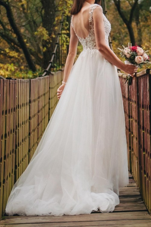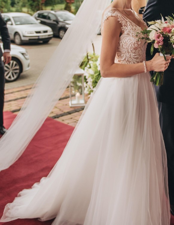 Góra na cielistej siateczce pokryta koronką w motyw kwiatowy, świetnie podkreśla dekolt. Dół składa się kilku warstw lejącego tiulu. Suknia jest delikatna i lekka, dzięki temu bardzo wygodna. Posiada podpinany tren. Kolor śmietankowa biel.