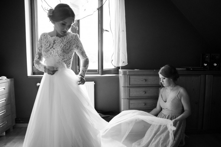 Do sukni dodam długi ciągnący się tiulowy welon oraz ozdobę do włosów.