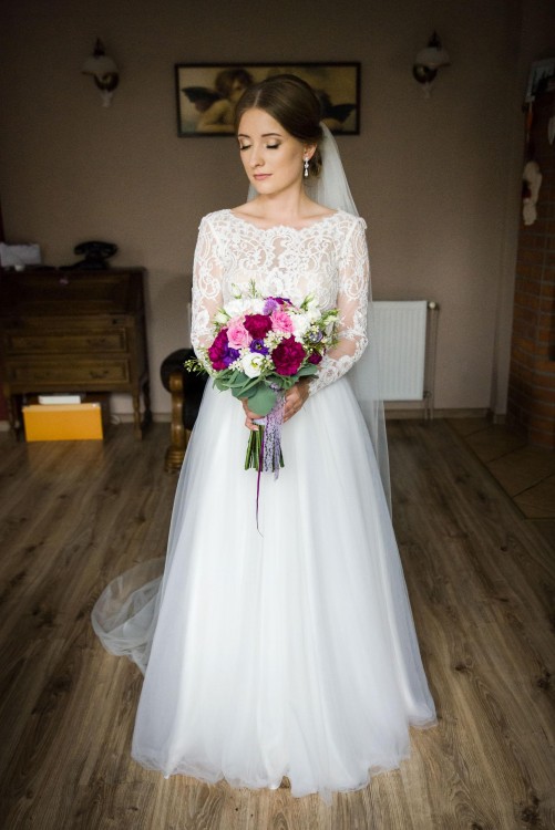 Witam, mam do sprzedania suknię ślubną marki Herm's Bridal Aragonite. Suknia składa się z pięknych koronkowych bodów i zwiewnej, muślinowej spódnicy. Body koronkowe na długi rękaw, zapinane są na kilka kryształowych guzików, z wycięciem w kształcie V, które pięknie eksponuje plecy. Suknia posiada długi tren podpinany na guzik, oraz wbudowane miseczki, gwarantując doskonałe dopasowanie bez konieczności zakładania biustonosza. Suknia posiada wpinane koło, ale i bez niego prezentuje się doskonale. Szyta na wzrost 155 cm + 6 cm obcas. Rozmiar 32-34.