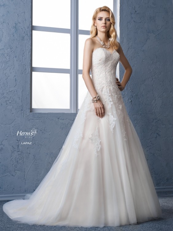 Uwaga: na stronie producenta: http://m.hermsbridal.com/kolekcie-sukni-slubnych/1220/lapaz/ jest zaprezentowany inny kolor sukni - kremowy. Proszę nie sugerować się tym kolorem.