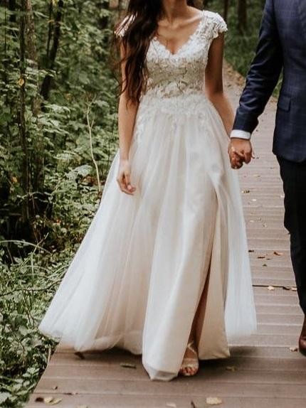 Suknia użyta raz, jest w stanie bdb. Bezpośrednio po uroczystości została wyprana chemicznie. Niewielkie postrzępienia tiulu sukni na samym jej dole. Rozmiar 32.