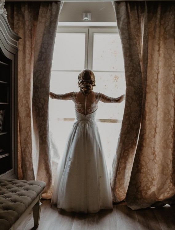Suknia ślubna z kolekcji Herms Bridal 2018, model Beverly z 3-metrowym welonem i oddzielnie zakładaną koronkową koszulką.