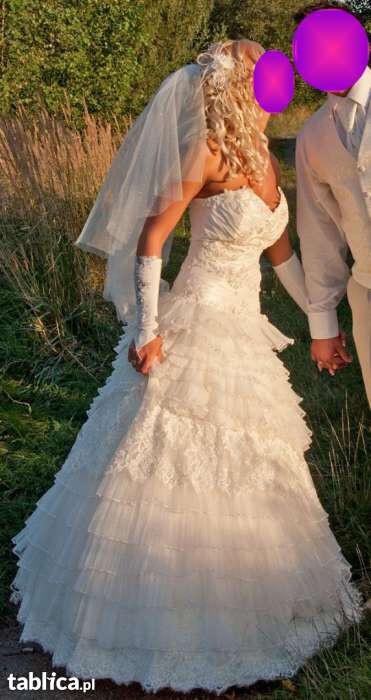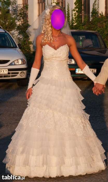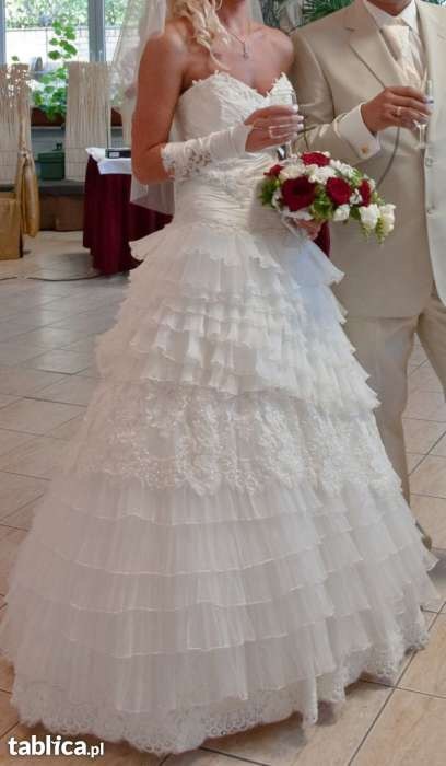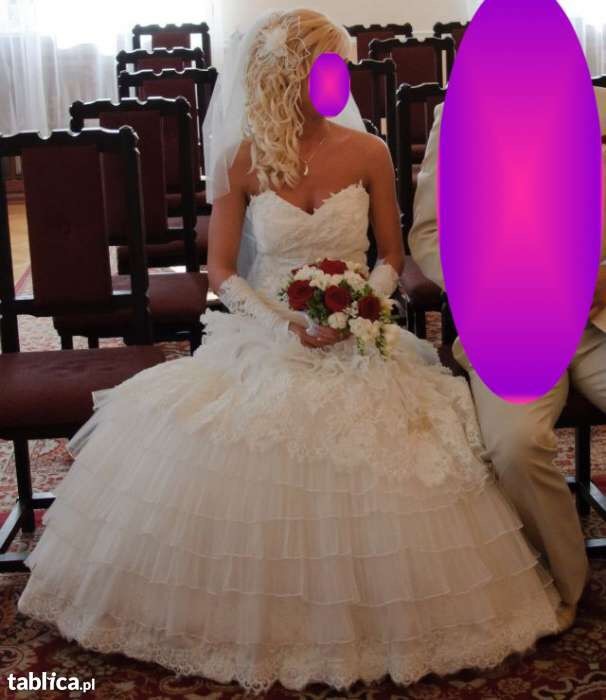 - sukienka jest w kolorze ecru ze wstawkami z koronki dodatkowo wysadzanej koralikami,