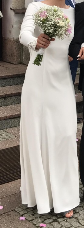 Suknia kupiona w salonie z kolekcj 2017 roku. Lekko wpada w ekri,nie jest to śnieżny biel . Z tylu ma pieknie wygięte plecy z chawtem. Na rękawach śliczne diamenciki do których łatwo jest dobrać podobna biżuterię .