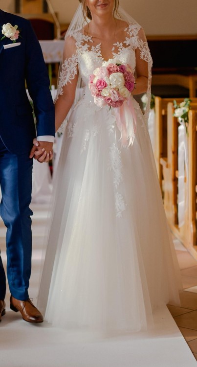Sprzedam suknię ślubną MS Moda z kolekcji 2019. Rozmiar 36 (możliwe poprawki do większego rozmiaru). Obcięta na wzrost 169 cm + obcas 9 cm.