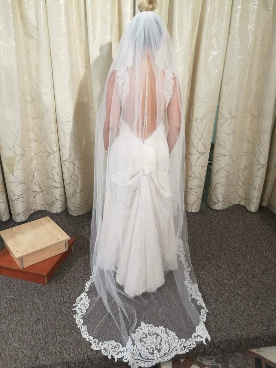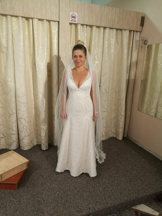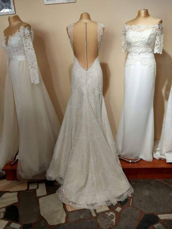 Bardzo kobieca suknia ślubna w kształcie rybki z trenem. Cała suknia uszyta z koronki tworzącej wzór rybiej łuski. Dekolt ozdobiony perełkowymi aplikacjami. Głęboko wycięte plecy przykryte przezroczystą, cielistą siatką zapinaną na kryształowe guziczki.