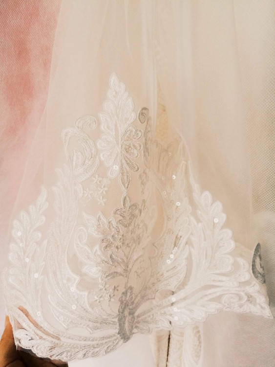 Oryginalna koronka, perełkowe zdobienia, plecy zapinane na guziczki, tren i długi welon.