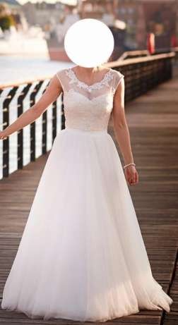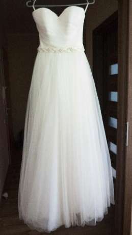 Suknia jest w kolorze ivory, jednoczęściowa, bez trenu, z wiązanym gorsetem, dzięki czemu idealnie dopasowuje się do talii. Została wykonana z miękkiego, delikatnego tiulu na wzrost 1,57 m (+ obcas 9 cm). Idealna dla Panny Młodej z większym biustem.