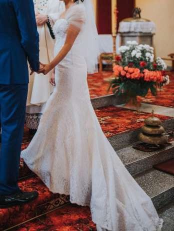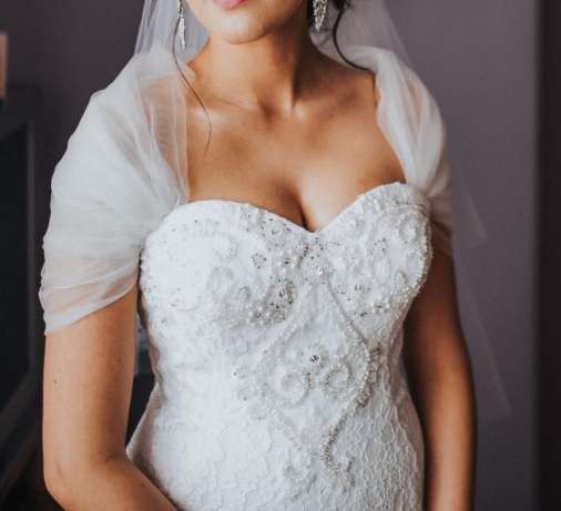 Suknia jest cała z koronki, posiada piękne zdobienia na gorsecie z pereł i cyrkonii.