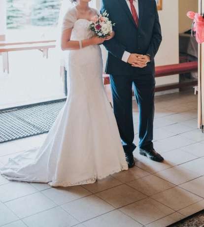 mam na sprzedaż piękną suknię ślubną marki Isabel, szyta według modelu Rita, ale z indywidualnymi zdobieniami na gorsecie (model z 2016 r.), rozmiar 38 (M). Jestem jej pierwszą właścicielką, zakupiona w salonie w Starogardzie Gdańskim, posiadam dowód zakupu. Kolor ivory (kość słoniowa).
