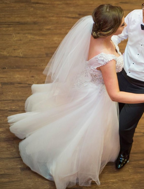 W zestawie halka, dzięki której suknia "nie wchodzi" między nogi przy tańcu i chodzeniu. Pięknie układa się w ruchu, halka nie posiada koła dzięki czemu nie odznacza się pod suknią w czasie poruszania się. Ramiączka gorsetu przerobione " w łódkę", gorset jest przedłużany dzięki czemu idealnie podkreśla talię i wysmukla sylwetkę. Suknia pomimo ilości ozdób jest bardzo wygodna, dobrze się w niej tańczy i siedzi.