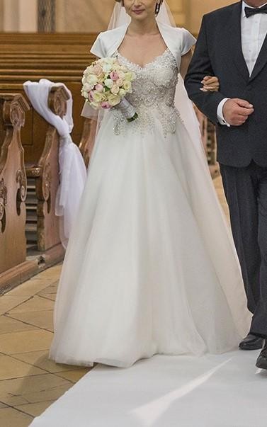 Na sprzedaż przepiękna suknia ślubna w kolorze IVORY. Suknia posiada przerobiony gorset z modelu sukni Maxima (dodatkowo wszyte usztywnienie na biust), dół z delikatnego, lejącego, kilkuwarstwowego tiulu.