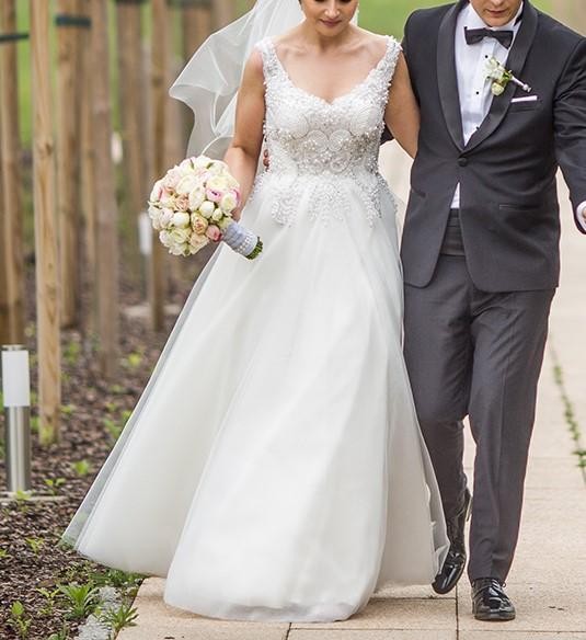 SUKNIA JAK NOWA, po weselu i sesji poślubnej została oddana do renowacji, górna warstwa tiulu została wymieniona na nową, suknia została profesjonalnie wyczyszczona i wyprasowana.