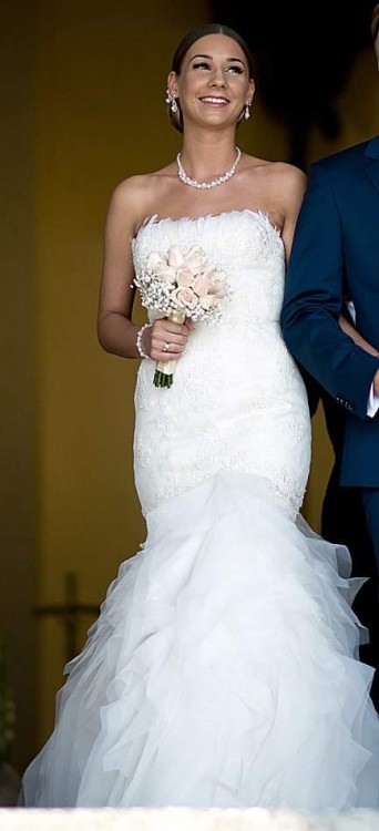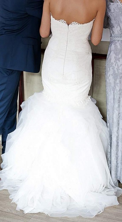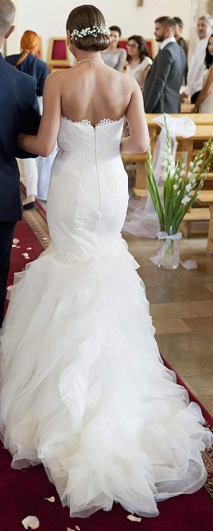 -- syrena, góra typu serduszko, wykończona prawdziwymi piórkami. (dołączam nowe pióra do sukni) Kolor: Ivory . Zapinana jest na suwak, posiada pas podtrzymujący,dzięki czemu jest dopasowana i nie ma możliwości by zsunęła się np. podczas tańca. Jest bardzo wygodna do tańczenia i lekka. Posiada piękny i długi tren, który można podczepić.Cena nowej sukni w salonie to 5.000 zł