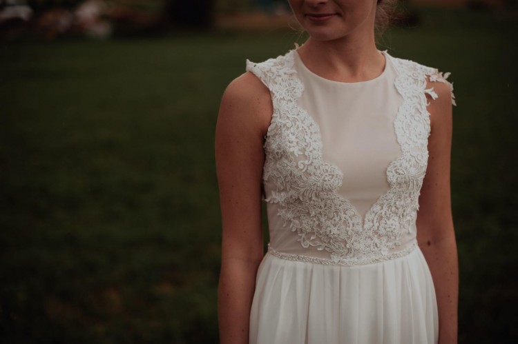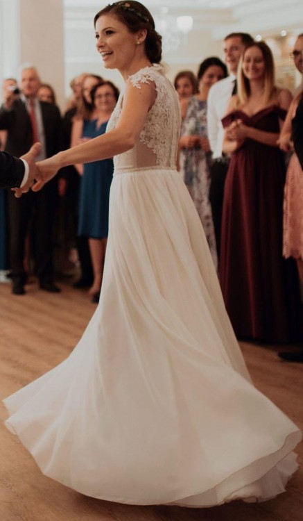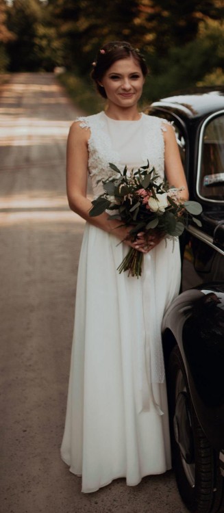 Góra sukni wykonana z koronki, podszyta podszewką kolor cielistego, dzięki czemu koronka koloru ivory staje się wyraźniejsza. Dół sukni uszyty jest z lekkiego muślinu( kolor ivory).