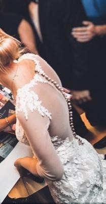 Ogromne wrażenie robią pięknie zdobione plecy pokryte idealnie dopasowaną do ciała cienką, elastyczną siateczką w neutralnym kolorze stapiającym się ze skórą. Z tyłu suwak ukryty pod rzędem guzików w formie białych półperełek.