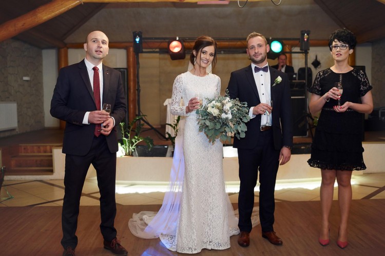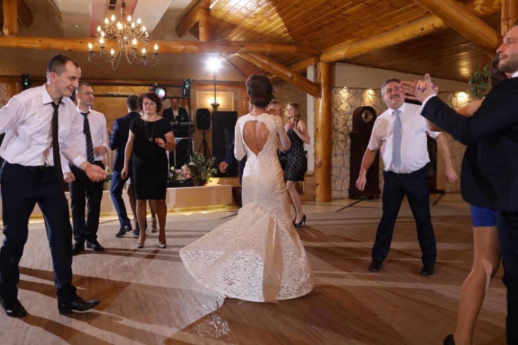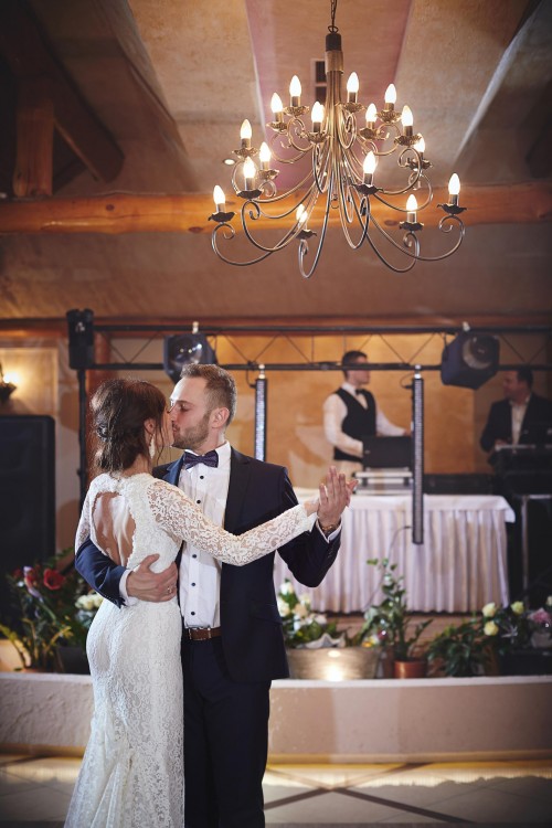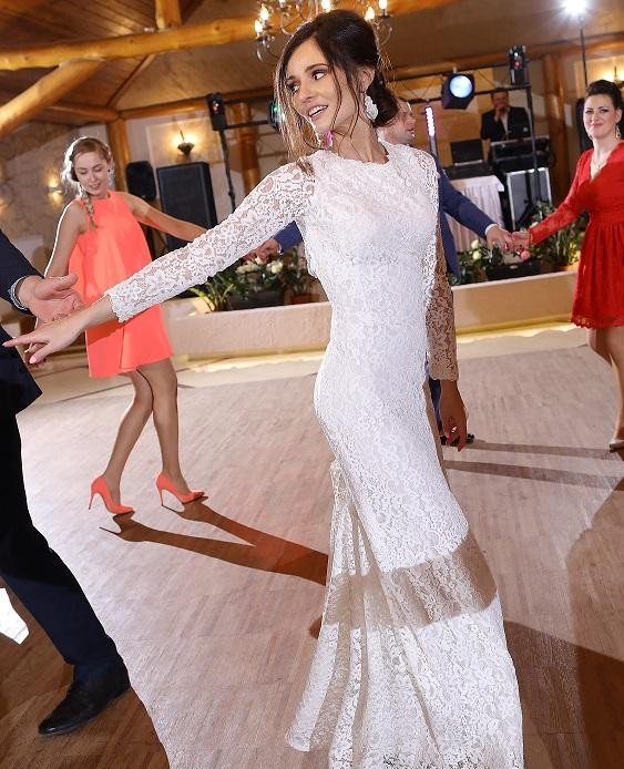 Z tyłu ma wycięte plecy, na szyi zapinana- dzięki temu bardzo dobrze się trzyma. Całość w koronce. Długi tren podpinany na guziki- pięknie układa się w tańcu. Do sukni dodaję welon 3 metrowy.