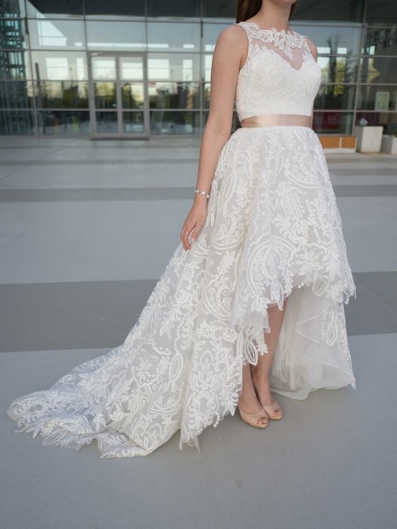 Do sprzedania mam przepiękną suknię projektu Justina Alexandra 9818 w kolorze ivory. Krótki przód (do kolan) przechodzi w dłuższy tren, który można podpiąć i tył zrównać do butów. Podpięcia są niewidoczne. Ze względu na ozdobny przezroczysty tył z przodu wszyto miseczki do podtrzymania biustu.