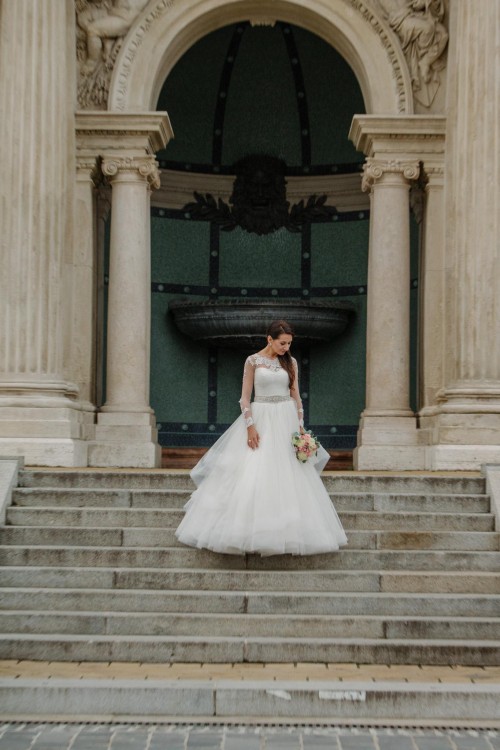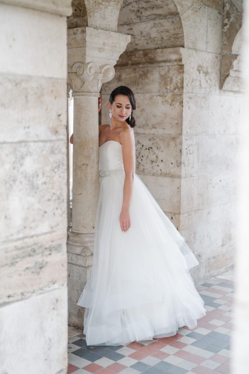 Piękna suknia Justin Alexander ma gładką górę, zdobioną pasem z kryształkami Swarovskiego, dół z delikatnego tiulu.