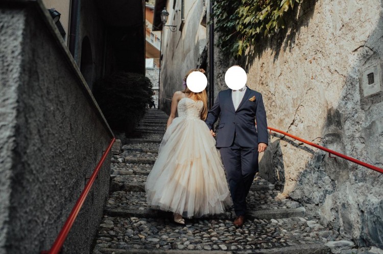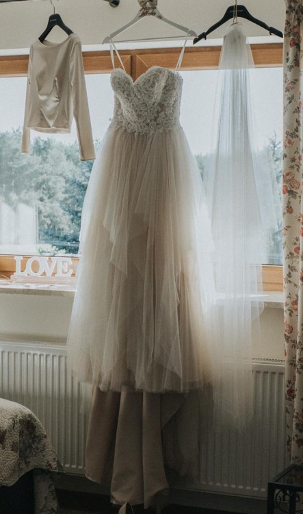 Suknia jest niezwykle lekka i bardzo wygodna. Niesamowicie układa się w tańcu. Dekolt w kształcie serca oraz zdobienia na gorsecie dodają sukni blasku i szyku. Suknia posiada podpinany tren. Zapinana jest na zamek błyskawiczny przykryty guziczkami.