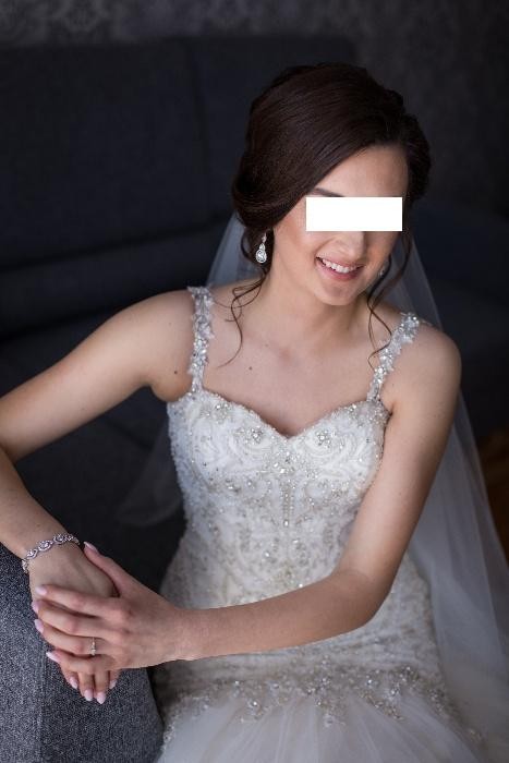 Witam, sprzedam suknię ślubną z kolekcji Justin Alexander. Suknia kupiona w salonie WHITE w Warszawie.Rozmiar 38, kolor ivoiry/silver.Pasuje na wzrost 172.Suknia posiada długi, podpinany tren widoczny za zdjęciach. Jest bogato zdobiona kryształkami. Z tyłu zapinana na suwak, który zakrywają ozdobne guziki. Możliwość obejrzenia i odbioru w Warszawie.