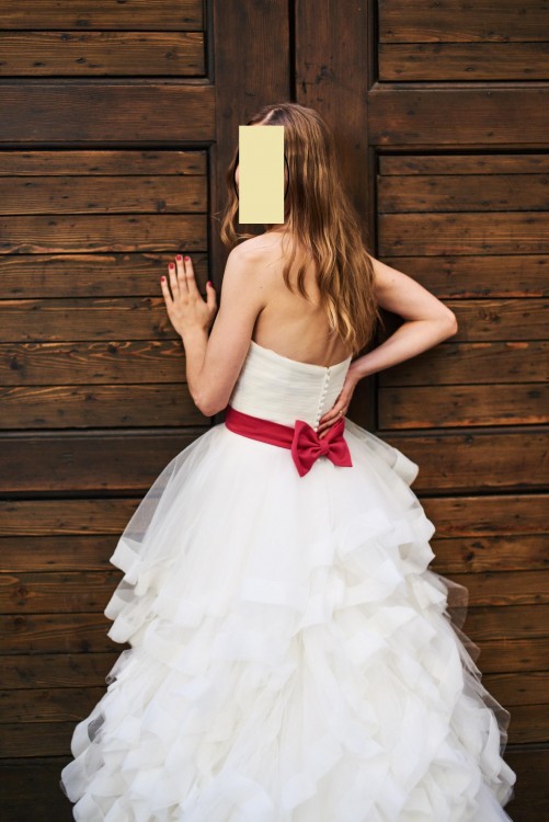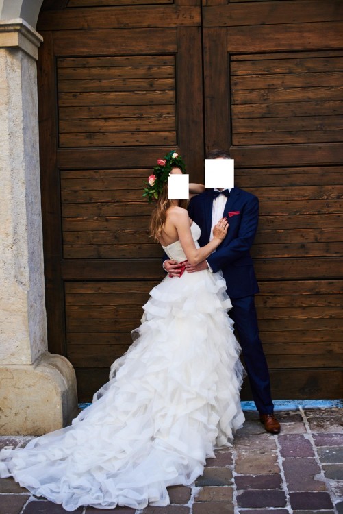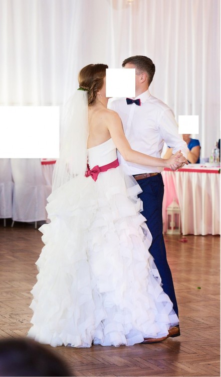 Suknia typu księżniczki z podpinanym trenem, pozwalającym na wszelkie wygibasy taneczne podczas zabawy weselnej (brak koła nie ogranicza ruchów). Dodatkowym atutem jest jej lekkość, mimo że optycznie sprawia wrażenie sporej. Zakupiona w salonie ślubnym w 2017 roku (posiadam dowód zakupu), odświeżona w profesjonalnej pralni sukien. Cena do negocjacji. Możliwość bezpłatnej przymiarki w Krakowie. Więcej informacji na priv.