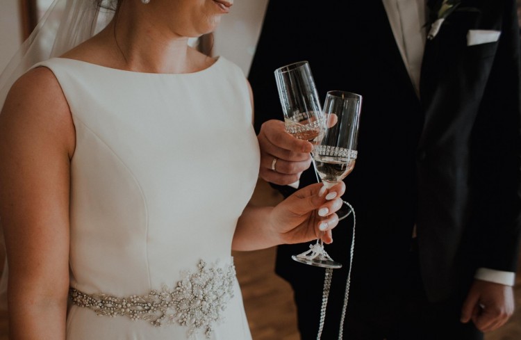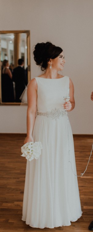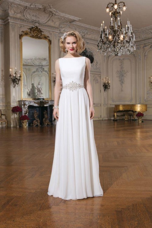 Suknia jest w kształcie litery A, szyta z koła, z dekoltem w łódkę, w talii zdobiona ręcznie wyszywanymi aplikacjami z kryształków Swarovskiego oraz perełek.