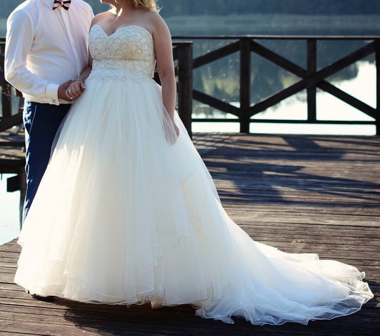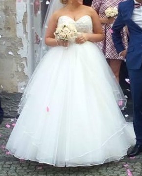 Sprzedam suknię ślubną znakomitego projektanta Justina Alexandra model 8786. Suknia założona 2 razy- raz na wesele i raz na sesję. Suknia jest koloru ivory. Stan idealny. Rozmiar mniej więcej 40 ze względu na to, że jest przystosowana również dla kobiet w ciąży i ma miejsce na brzuszek, a jednocześnie nie traci swojego fasonu. Jest z tyłu wiązana, dlatego może pasować na osobę drobniejszą, jak i większą niż w rozmiarze 40. Dopasowana do osoby o wzroście 163 cm + ok 10 cm szpilki. Posiada piękny tren, który dzięki specjalnym pętelkom można podpiąć, a suknia nadal wygląda olśniewająco. Gorset ozdobiony kryształkami Swarovskiego i perełkami, przepięknie się mieni. Suknia zakupiona była w Salonie White w Warszawie za 6000 zł. Zainteresowane osoby zapraszam do przymiarki. Cena do negocjacji.