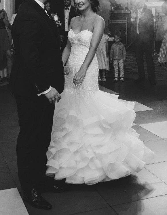 Suknia ma wszyte miseczki typu push-up, z możliwością wyprucia. Tren jest podpinany na guziczek. Została wyprana w profesjonalnej pralni.