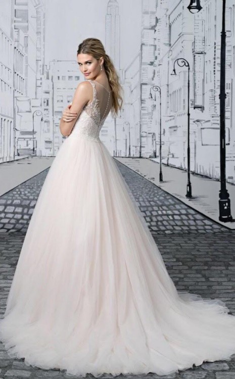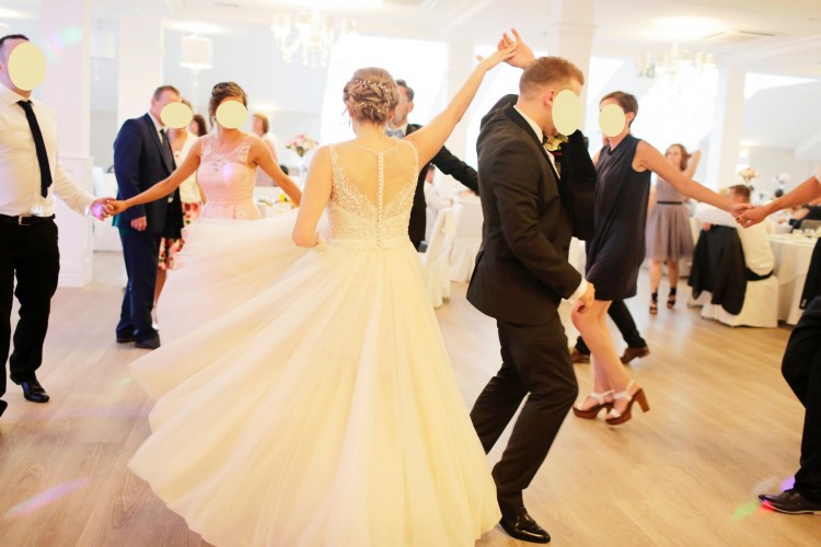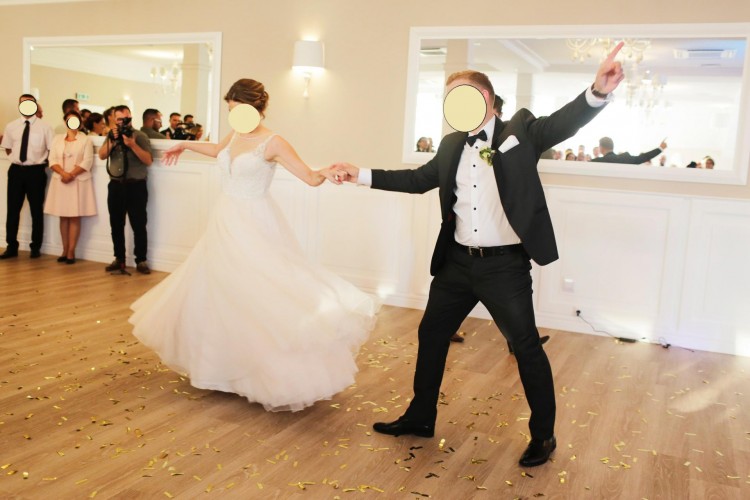 Suknia posiada podpinany tren, który może zostać łatwo skrócony podczas przeróbki krawieckiej. Rozmiar oceniam na duże 36 lub małe 38, jest swobodnie z czego ją zwęzić.