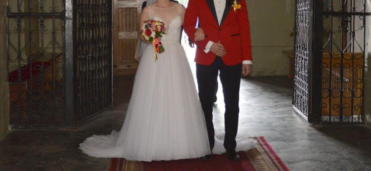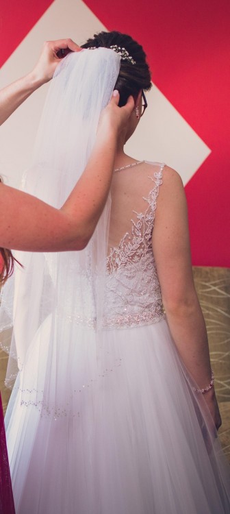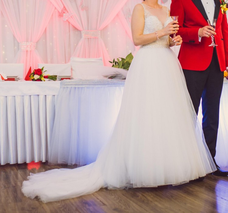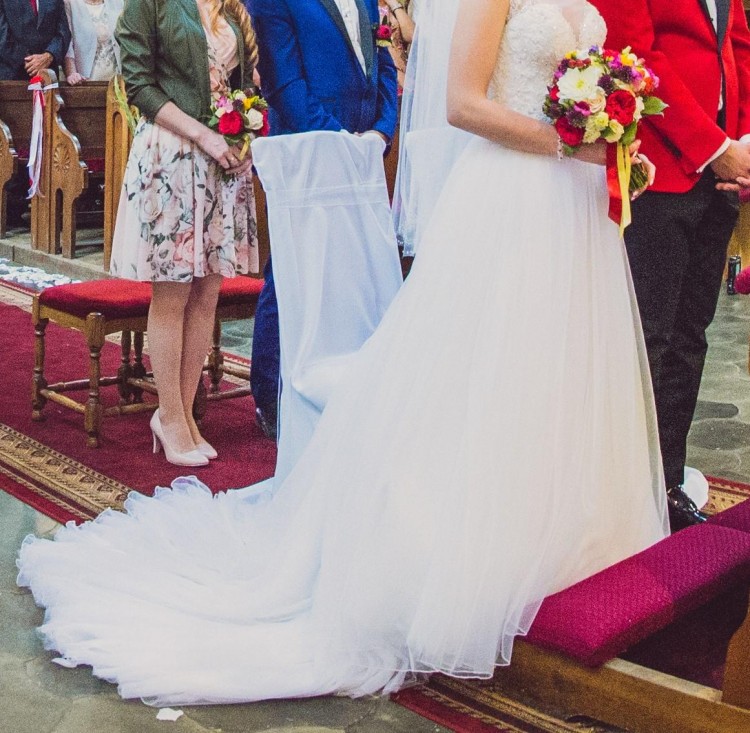 Góra sukienki to ręcznie wyszywany koralikami i kryształkami Svarowskiego gorset, dół wykonany jest z jedwabnego tiulu, który bardzo ładnie układa się podczas chodzenia i w tańcu. Sukienka różni się od oryginału doszytym paskiem, którym chciałam wzmocnić odcięcie talii. Sukienka posiada długi tren z możliwością podpięcia na zatrzaski, oraz wszyte miseczki push-up, dzięki czemu nie potrzebujemy do niej stanika.
